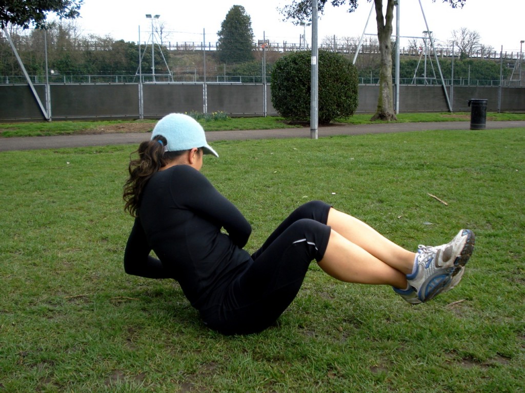 This is a great ab exercise that works your obliques! Sit with your legs up at around 45 degrees to the ground.Your back should be straight and your torso should also be approximately 45 degrees to the ground.